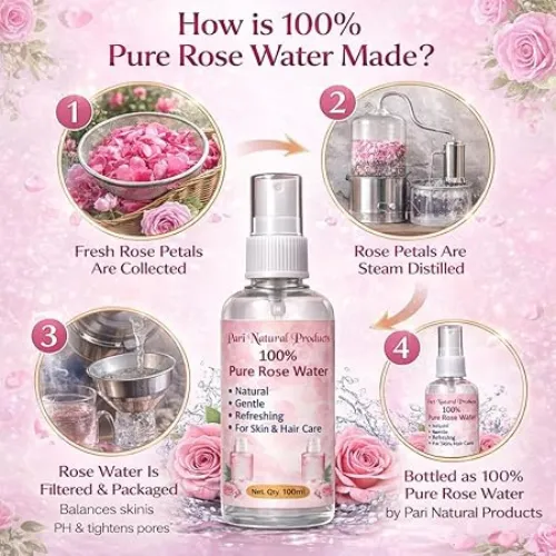 • 100% Pure & Natural Rose Water – Made from quality rose extracts that help gently cleanse, hydrate and refresh skin for a naturally healthy glow.