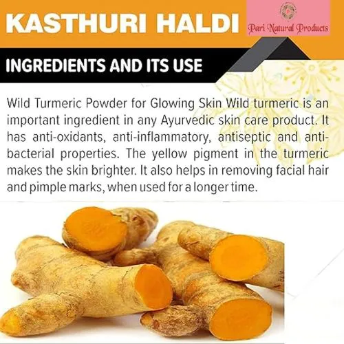 - 100% Natural Wild Turmeric Powder: Made from pure Kasturi Haldi (wild turmeric), this 150g powder is a key ingredient in Ayurvedic skincare, ideal for achieving naturally glowing and brightened skin