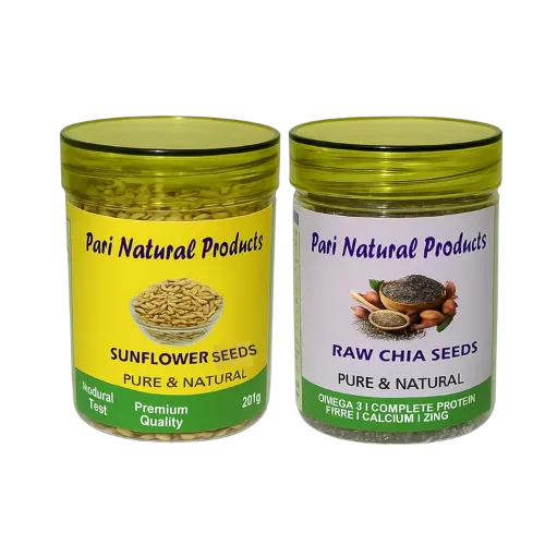 - Complete Superfood Combo for Daily Nutrition: This pack brings together two power-packed superfoods – raw chia seeds and sunflower seeds – offering essential nutrients in one combo. Chia seeds are known for their high Omega-3, calcium, and fiber content, while sunflower seeds deliver healthy fats, antioxidants, and vitamin E. Together, they promote heart health, skin glow, digestion, and overall energy. Whether you’re on a weight-loss journey, building muscle, or simply seeking clean nutrition, this combo provides the balance your body needs every day.