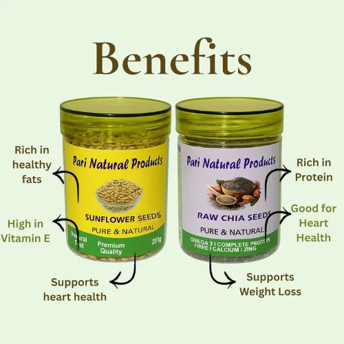 - Rich in Fiber, Protein & Good Fats: Chia and sunflower seeds are a great source of dietary fiber and plant-based protein, helping you stay fuller for longer and support digestive wellness. The sunflower seeds offer good fats and antioxidants that nourish your body from within. This makes the combo suitable for fitness lovers, vegans, and those on a keto or low-carb diet. Add them to yogurt, smoothies, or salads for a delicious, crunchy boost of natural nutrients with every bite.